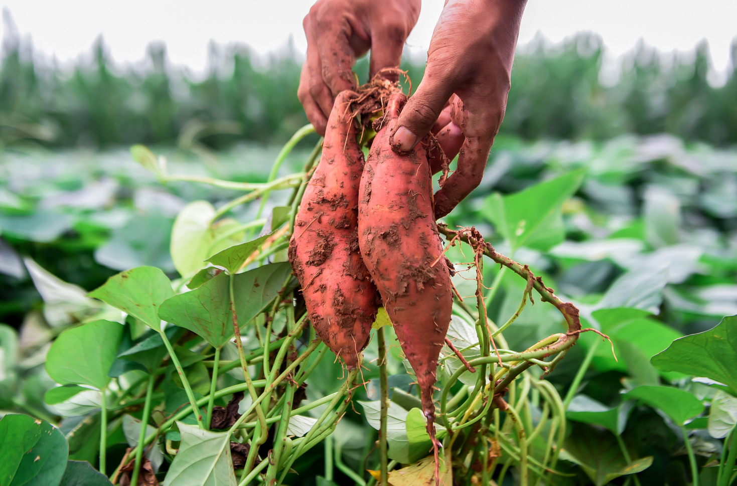 在一些干旱的沙土或許是丘陵地,多數是選用直插法來栽培紅薯。當把紅薯藤割回來以后,會先把它剪成17-20厘米長的薯苗,一棵紅薯苗大約3-4個結,然后直接把2-3個節插豎立著刺進土壤中,1-2個節留在土外,栽種的深度大約是10厘米左右。